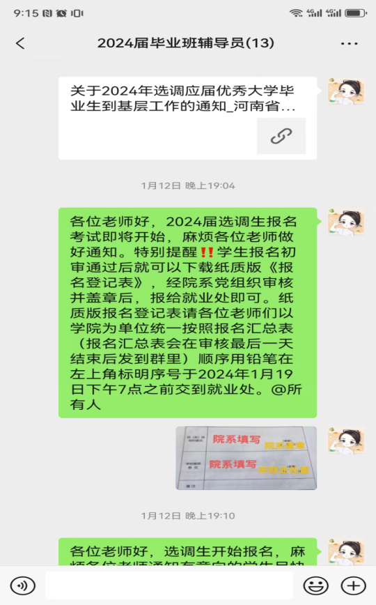 选调应届优秀大学毕业生到基层培养锻炼,是党中央着眼干部队伍长远发展实施的一项战略举措。为贯彻落实中央、省委关于选调生工作精结合河南实际,2024年继续选调应届优秀大学毕业生到基层工作。太阳网集团tcy8722按照通知有关要求严格审查报名资质,做好报考工作,符合条件的应届毕业生应报尽报,凡我校本科应届毕业生报名通过初审后,按照文件通知要求打印《报名登记表》,以学院为单位分别签署意见,并加盖学院党组织、学校党委组织部公章后,于1月19日下午各学院将纸质《报名登记表》统一上交就业处。