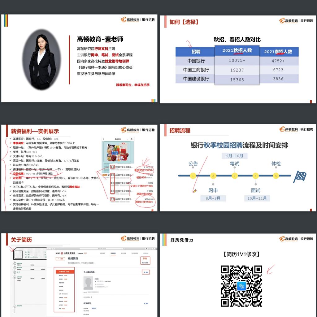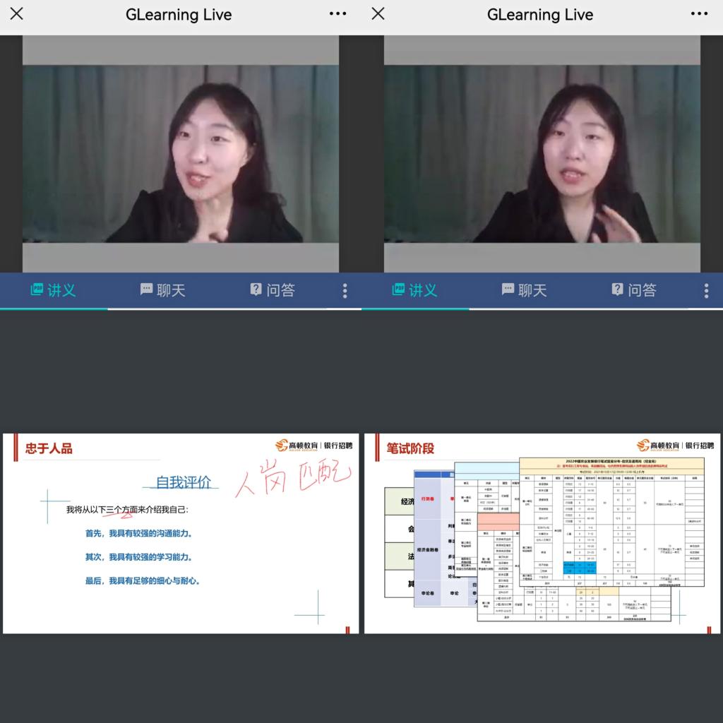 本次直播的重点是:银行考试和简历制作。此次会议前期有就业专员鲁玲玉老师和高顿教育的郝琦文博老师统筹协调,主讲为高顿教育的秦老师。