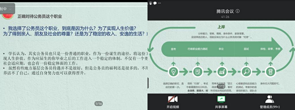 活动开始,张蕾书记介绍了此次活动的目的,以及秦世霖校友的基本情况。随后,校友秦世霖与同学们相约云端,以自己亲身经历从公务员岗位的工作状况、国考省考招聘单位的选择、考试的具体内容及难易度度分析、面试中遇到的问题及应对技巧等方面,分别给大家做了详细的介绍,并以实际题型为例给大家一一传授经验。在答疑的环节,秦校友更是耐心、细心,为同学们进行解惑,鼓励考公务员的同学们要做好选择,坚持下去,一定会有收获。