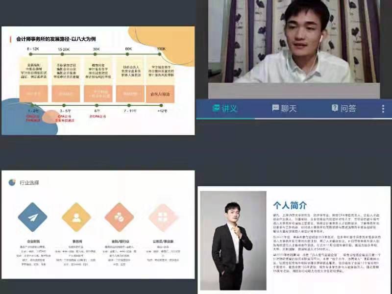 本次直播的重点是两大块学生关心的问题:财会类专业的行业分析和如何备战秋招。此次会议前期有就业专员鲁玲玉老师和高顿教育的郝琦文博老师统筹协调,主讲为高顿教育的吴凡老师。
