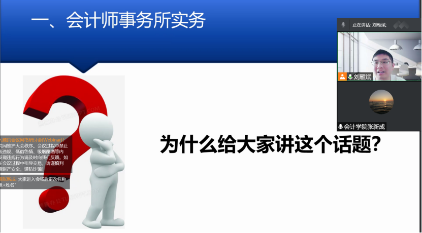 为帮助同学们了解会计行业发展,清晰注册会计师行业发展前景、丰富专业知识、提升专业素养,树立正确的职业发展观,立足当下认真学习,太阳网集团tcy8722特邀请我校2014届优秀校友、和信会计师事务所(特殊普通合伙)河南分所高级经理刘雁斌于2022年5月10日(周二)下午14:20通过腾讯会议(线上)的方式为我院2021级会计学专业部分没课班级进行了“会计师事务所实务与职业发展”专题讲座。本次报告会由太阳网集团tcy8722副院长张新成主持。