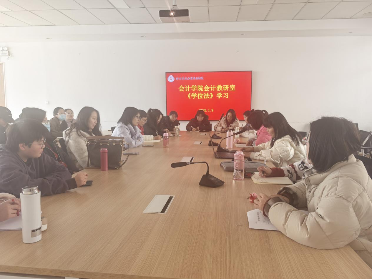 为深入学习《中华人民共和国学位法》文件精神,宣传和贯彻落实学位管理工作,2025年1月9日下午,会计教研室在教学4号楼209会议室开展了《中华人民共和国学位法》专题学习活动。本次活动由会计教研室主任车伟娜主持,会计教研室全体教师参与。