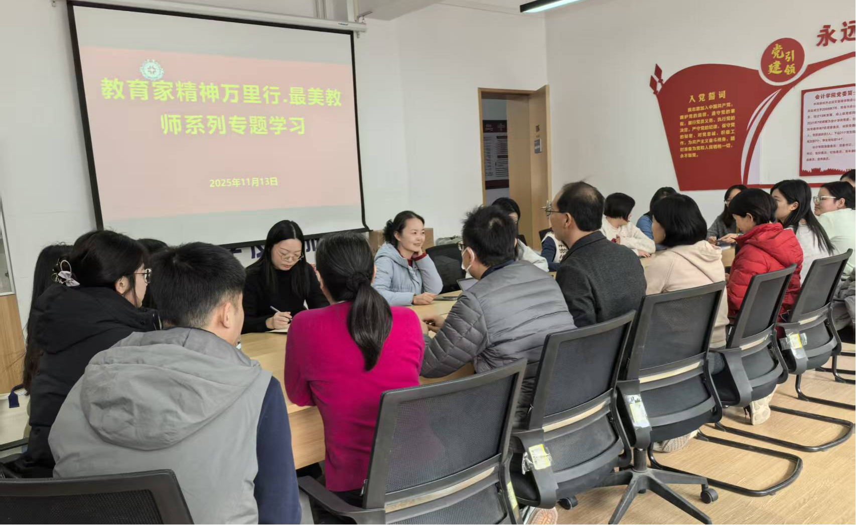 为深入贯彻落实党的教育方针,弘扬教育家精神,强化师德师风建设,加强新时代高水平教师队伍建设。太阳网集团tcy8722财务管理教研室于2025年11月13日在教学四号楼116开展“教育家精神万里行·最美教师系列”专题学习交流会,会议由教研室主任何保国主持,财务管理教研室全体教师参加。