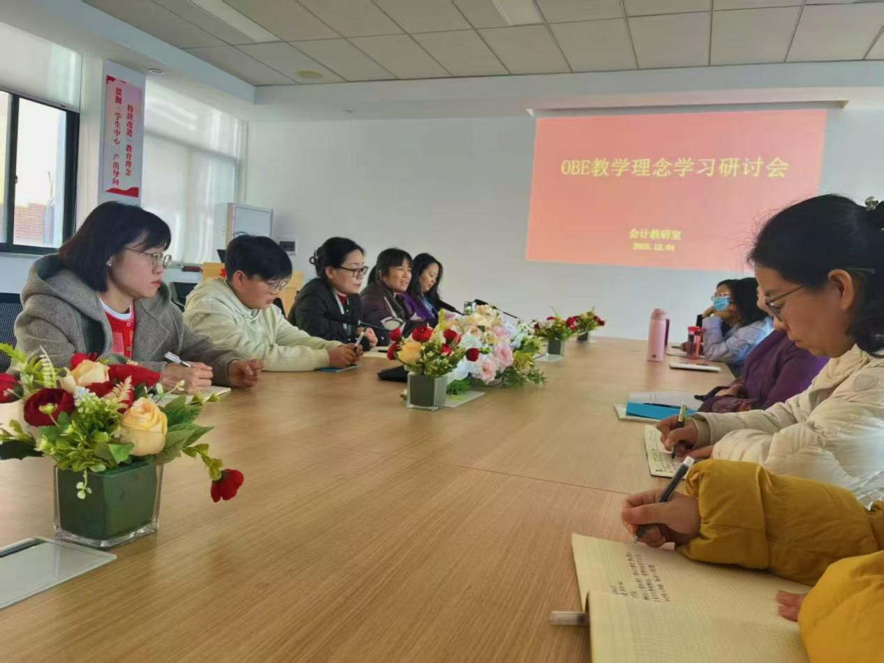 为深入贯彻落实学校教育教学改革要求,积极推动成果导向教育(OBE)理念在会计学专业教学中的融合与实践,2025年12月4日中午,会计教研室在4号楼209室召开了OBE教学理念专题学习研讨会。本次会议旨在总结2025年11月29日至30日学校举办的OBE专题培训成果,交流学习体会,进一步凝聚共识,明确教学改革方向。