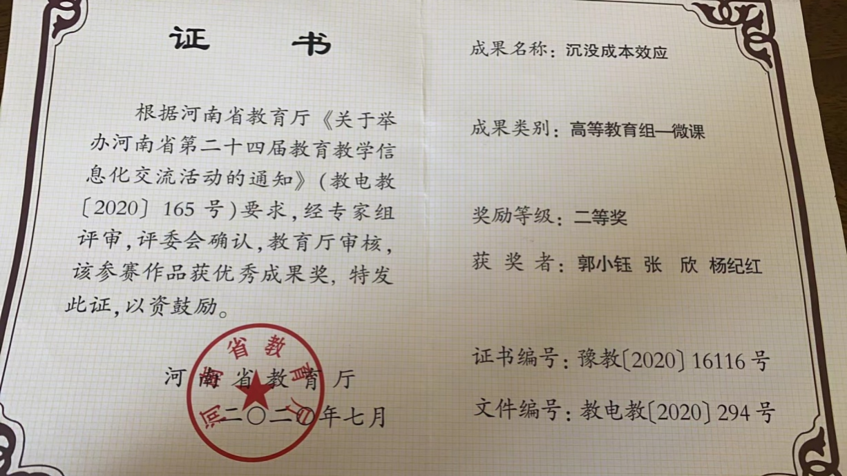 根据河南省教育厅《关于举办河南省第二十四届教育教学信息化交流活动的通知》(教电教[2020]165号)要求,我院郭小钰老师参与了河南省教育厅举办的第二十四届教育教学信息化交流活动,经过专家评审,太阳网集团tcy8722的郭小钰、张欣等老师的微课《沉没成本效应》获得高等教育组——微课二等奖。