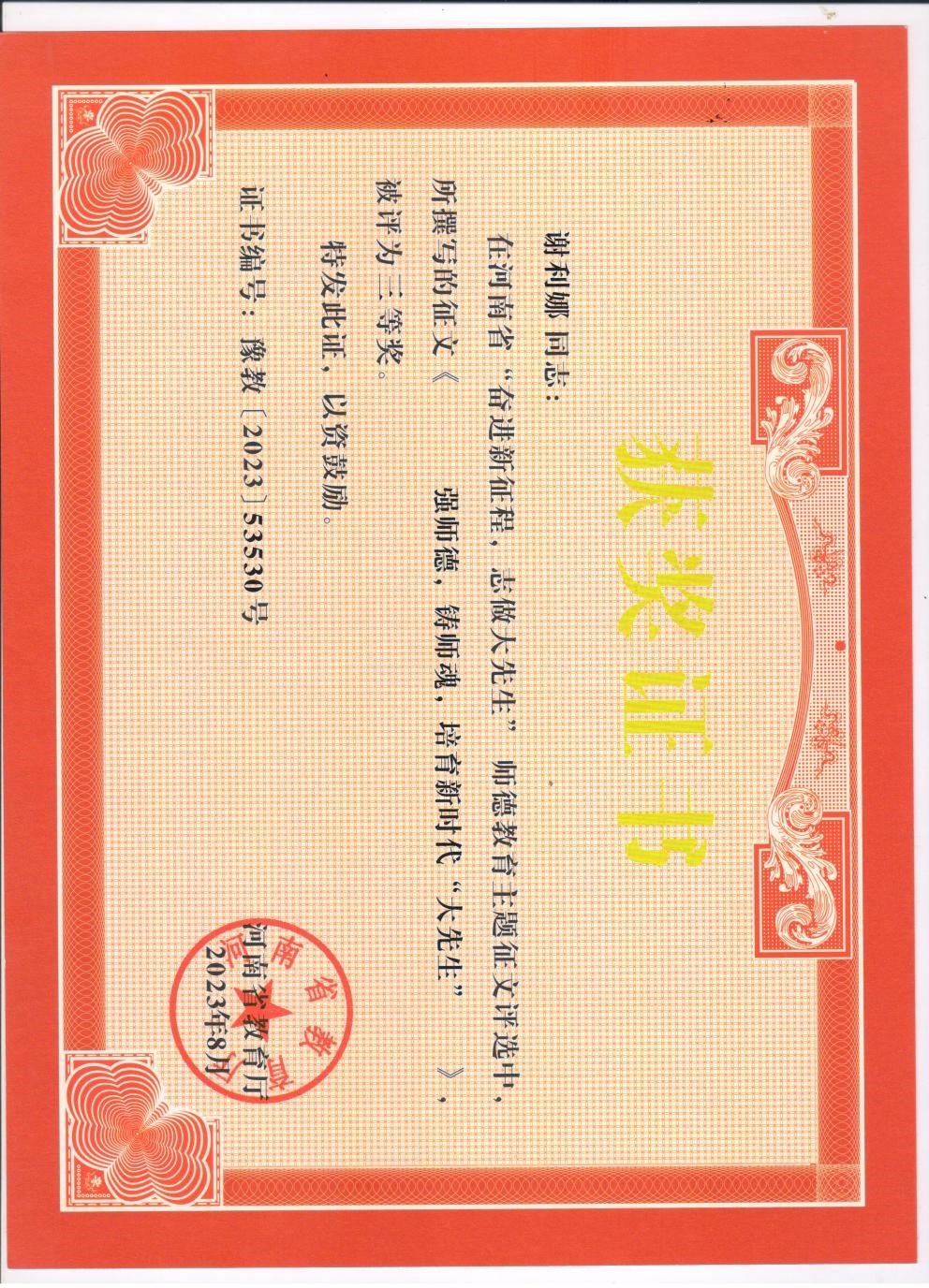 2023年8月,在河南省教育厅举办的“奋进新征程,志做大先生”师德主题教育征文和师德师风优秀案例评选活动中,太阳网集团tcy8722财务管理教研室谢利娜老师参加了此次征文活动。谢老师撰写的《强师德,铸师魂,培育新时代“大先生”》一文荣获师德教育主题征文三等奖。