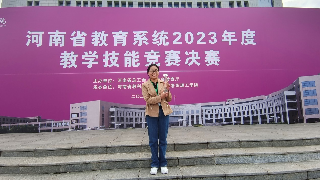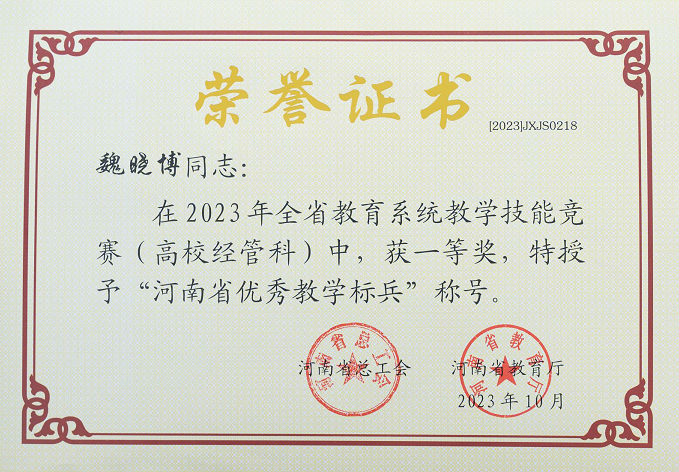 魏晓博老师积极备赛,在现场决赛中表现优异,荣获一等奖,并被授予“河南省优秀教学标兵”称号。