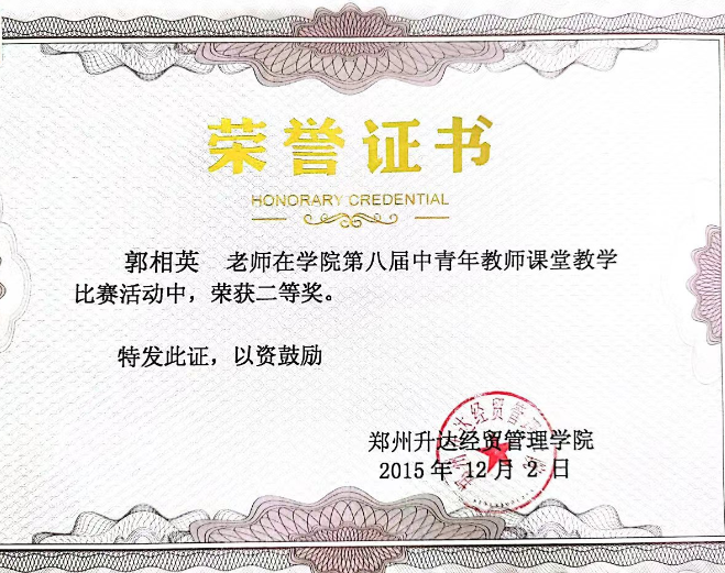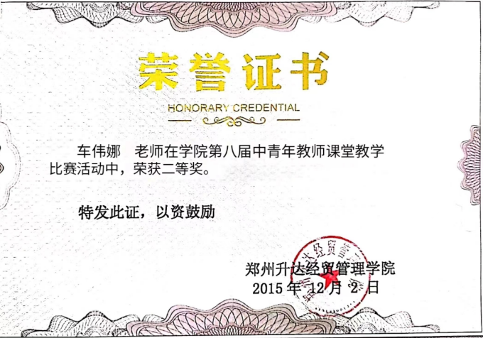 2015年11月19日下午,我校组织了第八届中青年教师课堂教学比赛决赛,经过预赛、决赛,历时十周终于落下了帷幕。由16位评委评议打分,会计系车伟娜老师和郭相英老师以93.78的高分并列第二名,双双荣获二等奖,取得了会计系教师参赛以来的最好成绩!