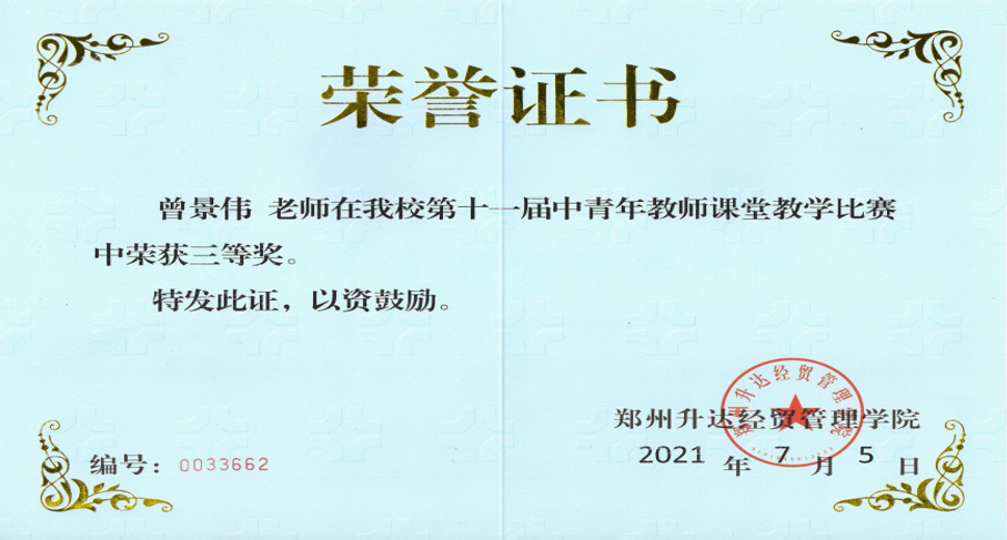 太阳网集团tcy8722曾景伟老师在我校第十一届中青年课堂教学比赛中喜获三等奖