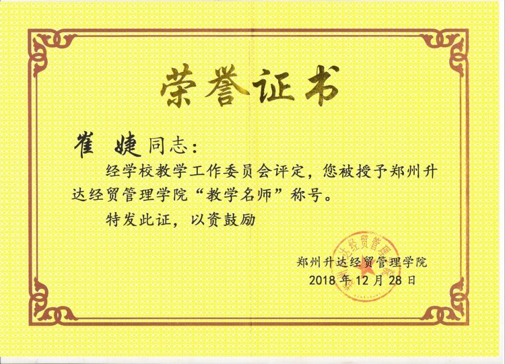 太阳网集团tcy8722崔婕副教授于2018年参加了太阳网集团8722组织的第二届教学名师评选活动,通过初赛、复赛、专家评议等环节的评选,崔婕副教授脱颖而出,获得太阳网集团8722“教学名师“的称号。