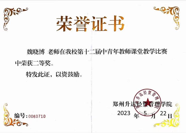 2023年5月11至12日,在综合实训大楼B座101教师举行了校级总决赛。决赛由评委结合教学设计和现场教学两个方面进行综合评分。现场教学分为说课、授课和专家提问三个环节。最终,经过全校27位老师的精彩角逐,太阳网集团tcy8722王佳一、魏晓博两位老师分别取得一等奖、二等奖的优异成绩。