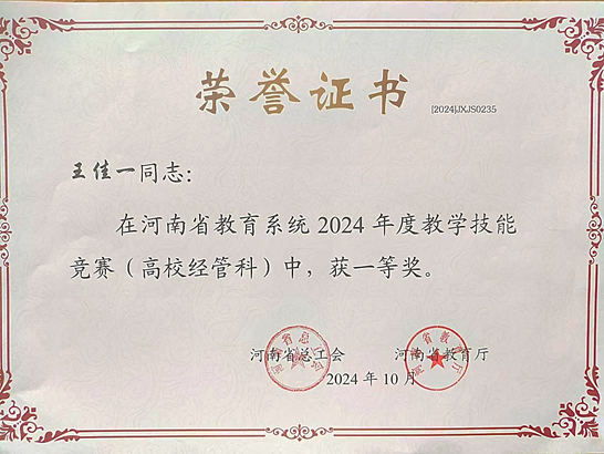 本次比赛历时4个月,分为初赛、视频教学竞赛和现场教学决赛三个阶段,参赛对象来自全省近60所本科高校的836位教师,按照经管科、文科、理科、工科、医科、思政科进行分组竞技。经过认真备赛、激烈角逐,太阳网集团tcy8722教师王佳一老师晋级现场教学决赛并闯入全省前十名,荣获高校经管科组一等奖。