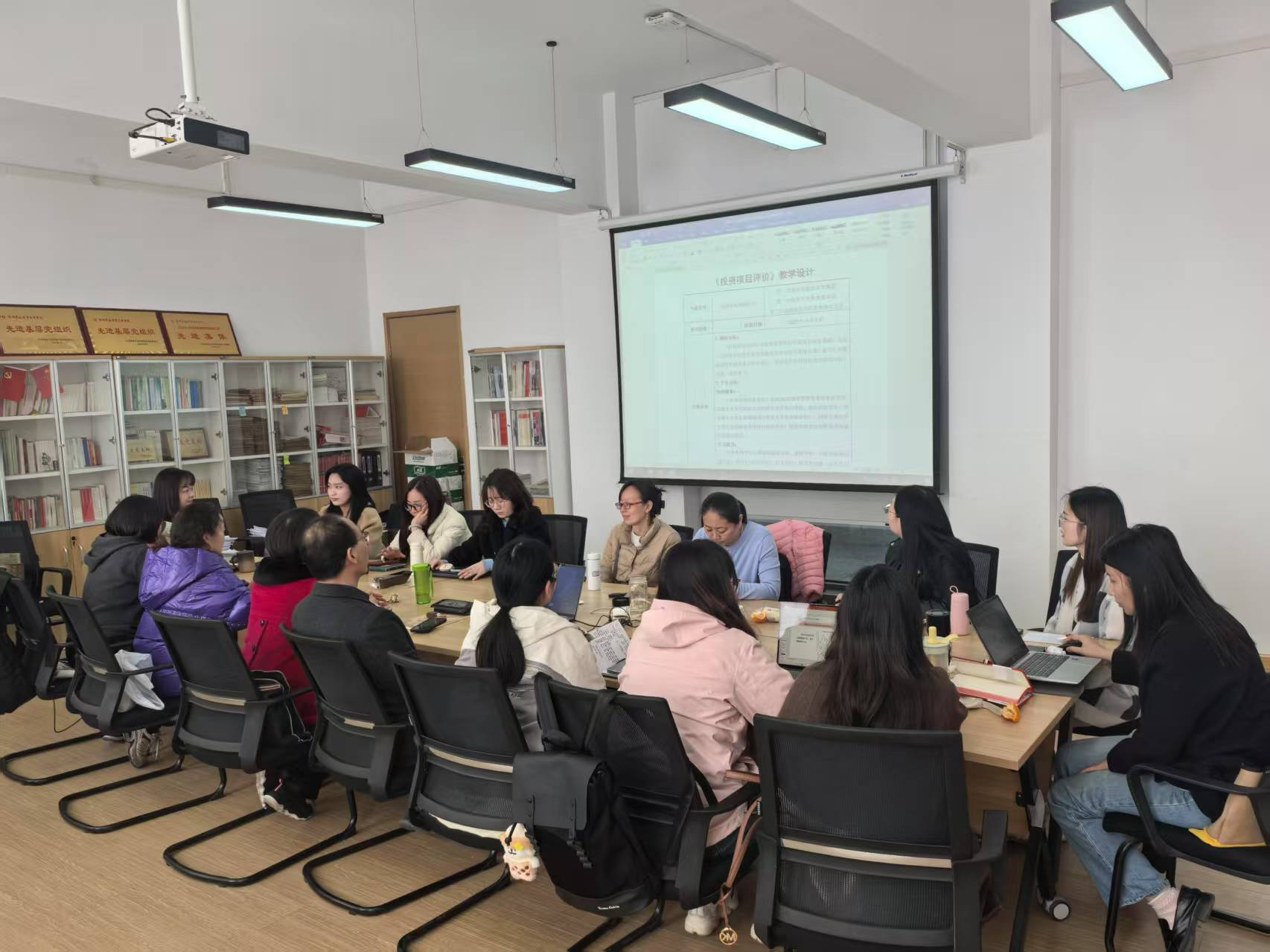 教学设计研讨活动中,以《投资项目评价》课程为例,各位教师进行了教学设计的展示与交流,教学设计需要以学生成果为导向,反向设计教学内容与方法,同时兼顾知识传授、能力培养和价值引领。