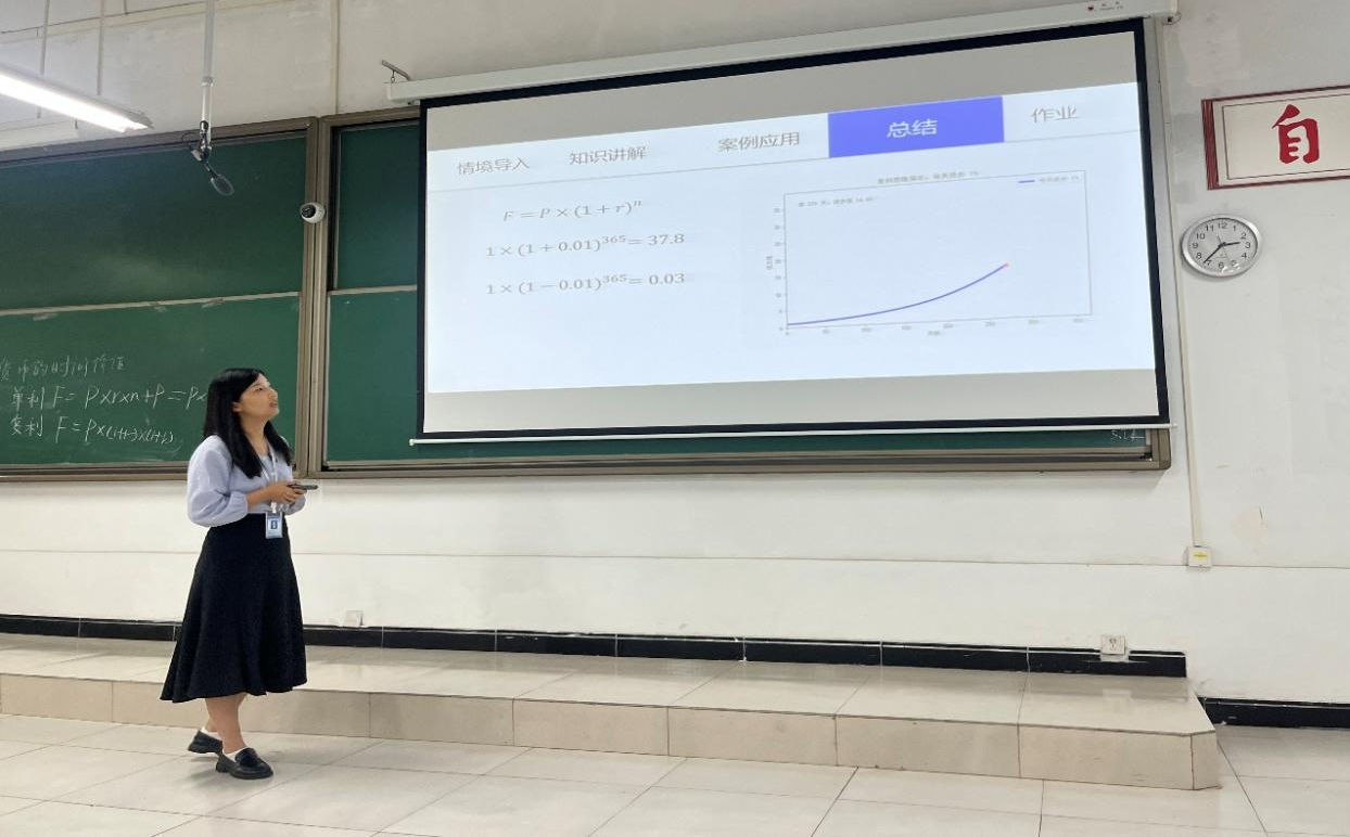 周娟老师展示了《财务管理》课程思政教学设计,采用情景导入法,通过引入时代变迁中的物价波动、投资决策等鲜活案例,让抽象的货币时间价值概念变得清晰易懂,在阐释单利、复利的计算方法同时揭示了“厚积薄发、行稳致远”的人生哲理。