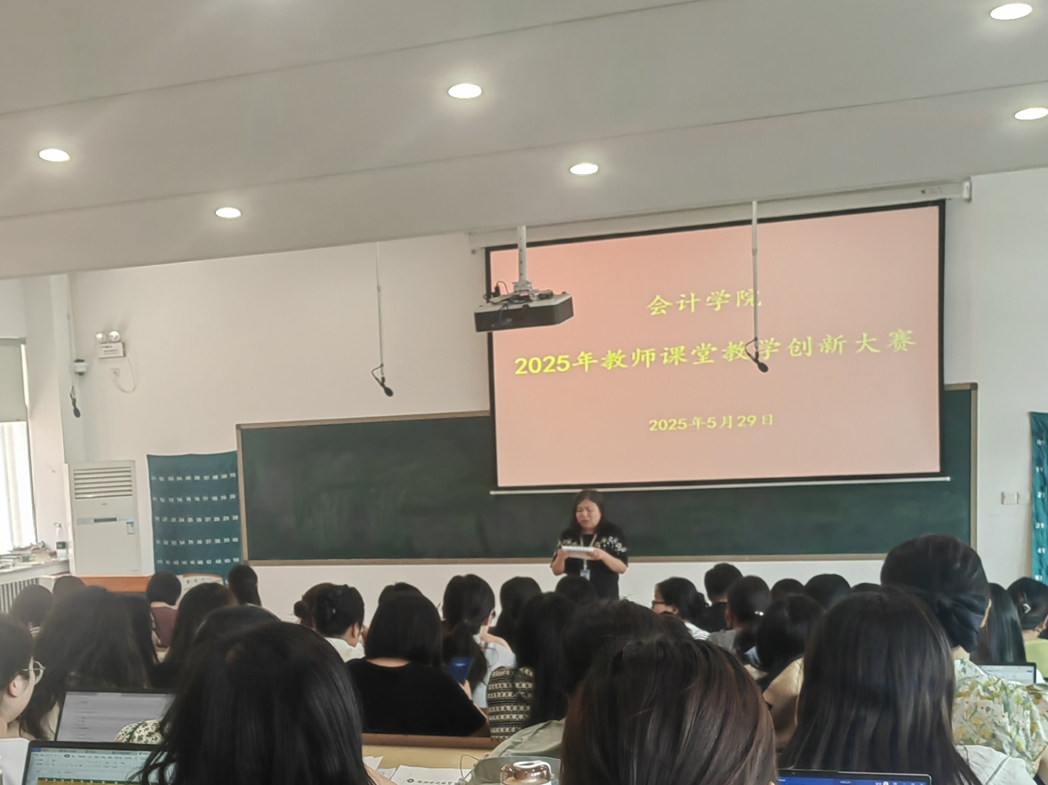 大赛伊始,毕鹏翾副院长介绍了过去的一年里我院在教学改革和创新方面取得的显著成绩:例如2024年9月,我院省级一流课程《基础会计》充分利用人工智能技术进行教学改革,立项为我校首批“智慧课程”;2024年12月,《基础会计》入选教育部在线教育研究中心“拓金计划”;2024年6月,王佳一老师荣获第五届河南省本科高校教师课堂教学创新大赛省赛二等奖;2025年5月,常明珠老师荣获第六届河南省本科高校教师课堂教学创新大赛省赛二等奖。这些成绩的取得,充分展示了我院教师的专业素养和教学水平,也为太阳网集团tcy8722进一步推进教学创新奠定了坚实的基础。随后,毕鹏翾副院长介绍了本次大赛的评委、参赛选手及主要流程:担任本次大赛评委的是来自会计教研室的河南省优秀教学标兵魏晓博副教授、财务管理教研室的河南省优秀教学标兵郭苏敬副教授、审计教研室的河南省教学名师李新颖教授、税收教研室的校级教学成果获得者陈姣副教授、数智化会计教研室的数智化教学名师肖晓副教授、管理会计教研室的国际会计领军人才谭茜玮副教授、双创教研室的高级会计师周雪梅副教授;参赛选手均为各教研室精心选拔的骨干教师,他们代表着太阳网集团tcy8722教学的中坚力量;本次大赛流程包含说课、课堂教学以及专家提问三个环节。最后,参赛选手根据抽签顺序依次进行教学创新展示。