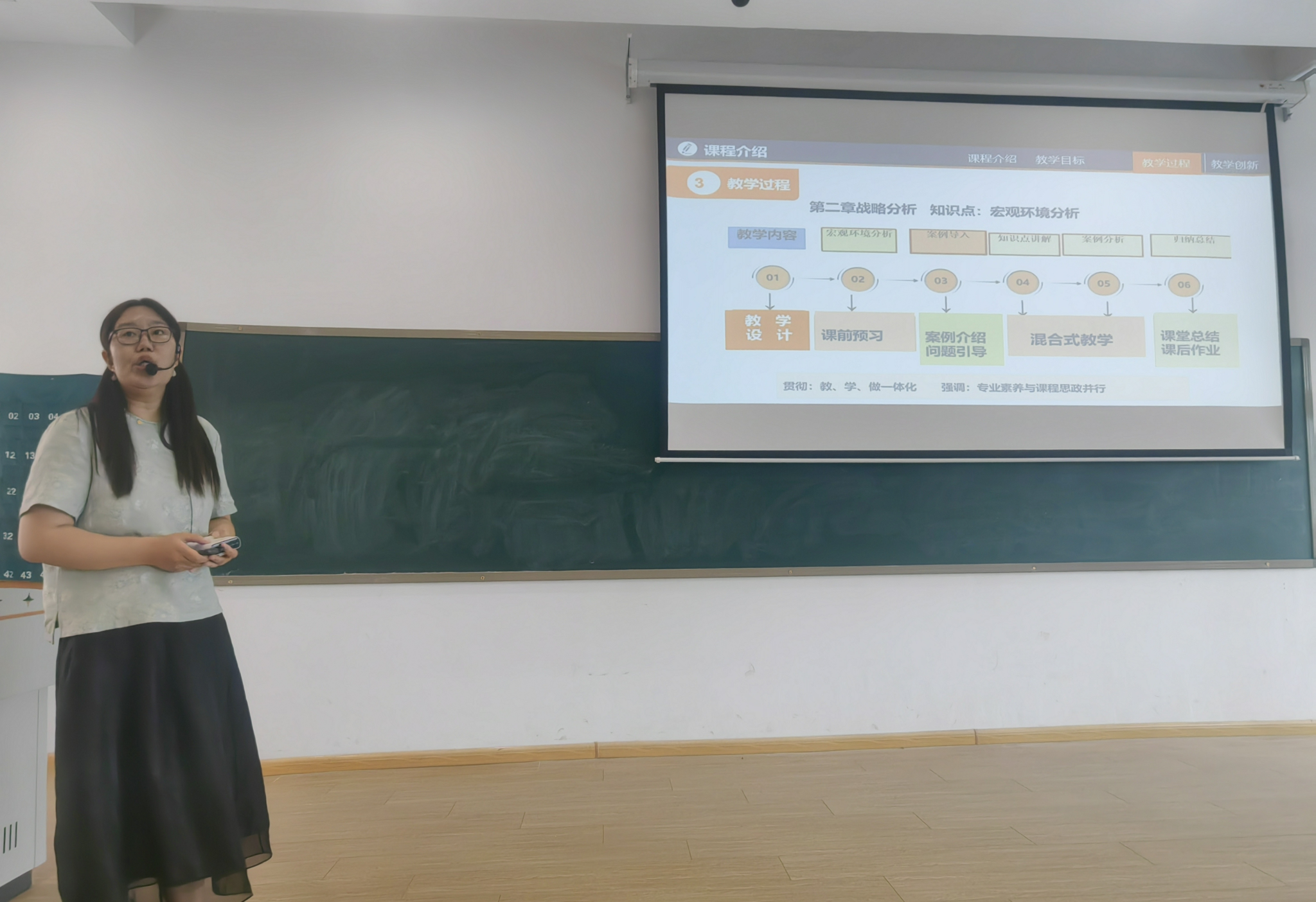 郭小钰老师展示了《公司战略与风险管理》课程中“宏观环境分析”教学设计,她巧妙地借助2023 年华为 mate 60pro 发布这一热点事件,引出“中华有为”,形象地阐释了宏观环境分析相关知识。