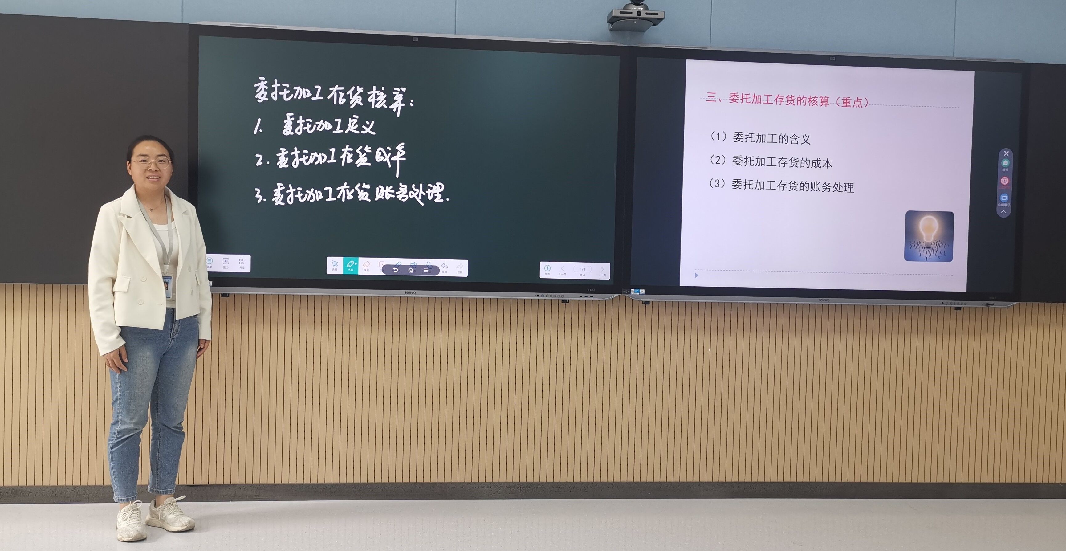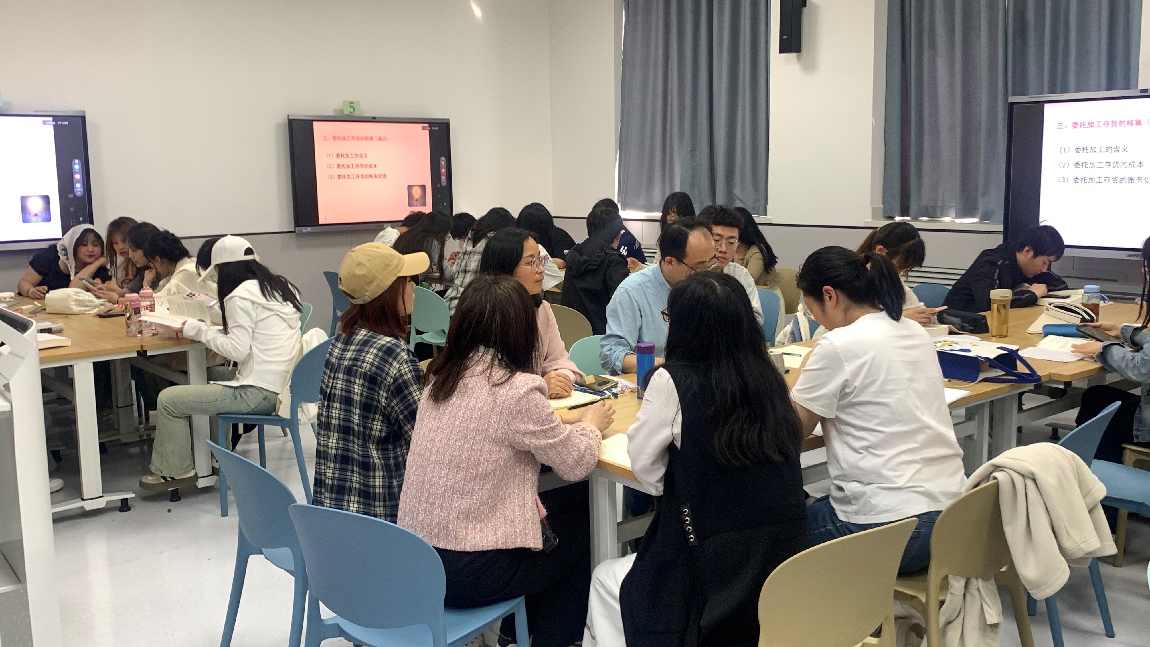 陈伟利老师讲授的内容是关于委托加工存货的核算,采用的教学方法是案例教学、混合式教学和讨论式教学。陈老师首先在开始讲授前,检查了课后布置的线上预习任务,接着通过“年菜预定菜单”的案例为大家引入委托加工存货的含义,过年时预定菜单,既可以选择配送服务,也可以选择购买服务,这主要取决于消费者的具体需求和情况。