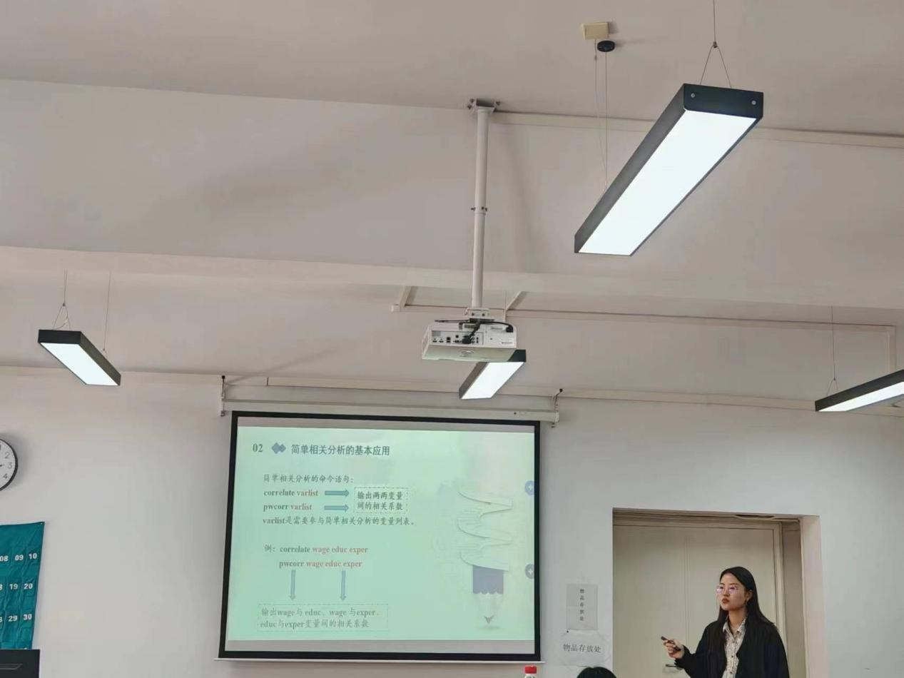 观摩会上,首先,郭怡珊老师以“蝴蝶效应”为切入点,对《统计分析与STATA应用》课程中的“相关分析”进行了深入浅出的讲解,并在讲解过程中向学生传递“万物相联”的思政要点。