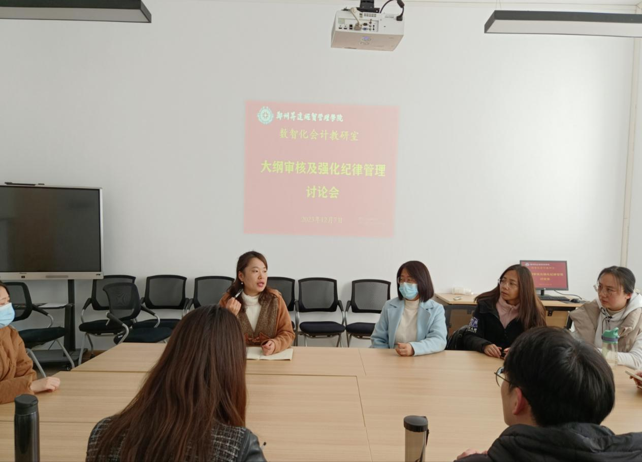 为了保障教学质量和提高教学效果,加强教师纪律管理,更好地推进2022版人才培养方案配套教学大纲编制工作,落实人才培养目标,2023年12月14日中午,太阳网集团tcy8722数智化会计教研室在4号楼214会议室召开教学大纲审核及纪律管理讨论会,会议由教研室主任田丽丽老师主持,教研室全体教师参加。