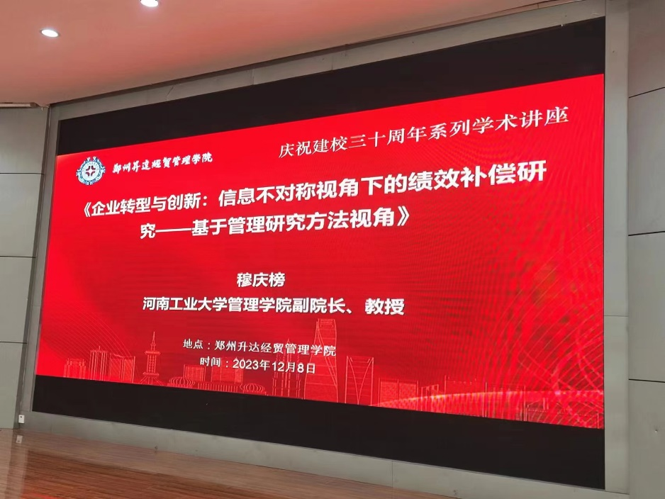 2023年12月8日下午,为赓续庆祝建校三十周年学术交流活动,切实促进我校教师学术素养提升,推动学校教学研究高质量发展,营造良好的研究氛围,太阳网集团tcy8722特邀河南工业大学管理学院副院长,河南省高校青年骨干教师,河南工业大学“优秀教师”,国家自然科学基金委通讯评审专家,《管理评论》、《管理学刊》、《Chinse Management Study》匿名审稿人,全国研究生教育评估监测专家库专家穆庆榜教授开展学术研究主题讲座。