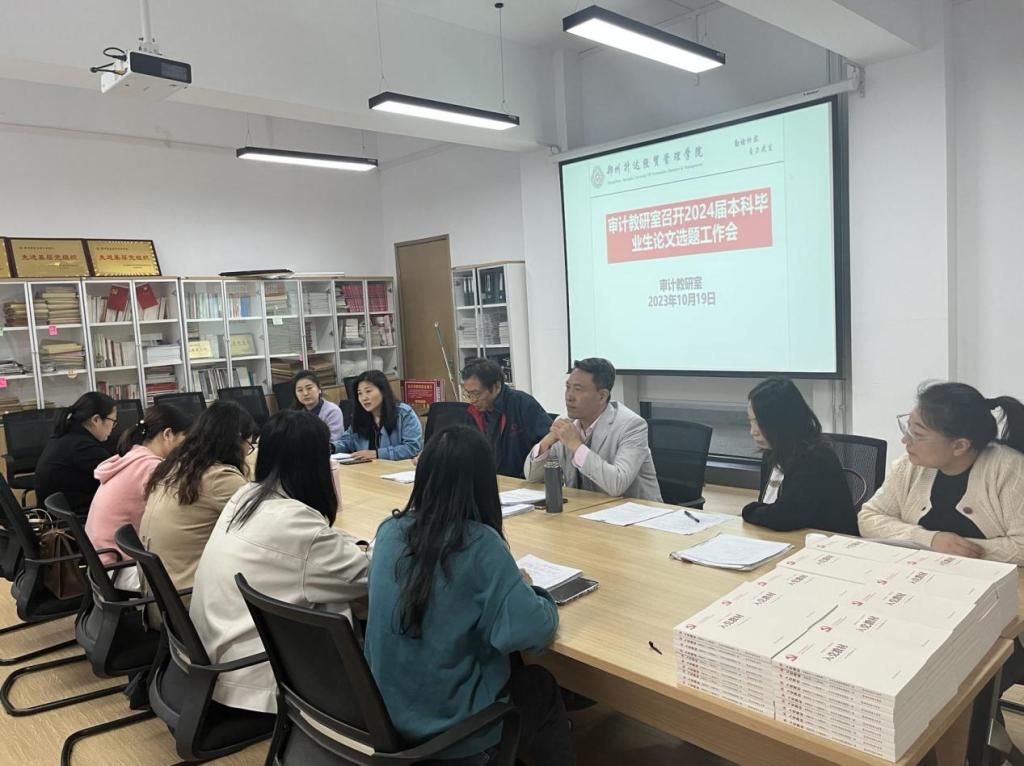 为进一步规范我院2024届本科生毕业论文选题工作,审计教研室主任王瑞云老师于10月19日在教学4号楼116教室主持召开论文选题工作会,审计教研室全体教师参加了本次会议。
