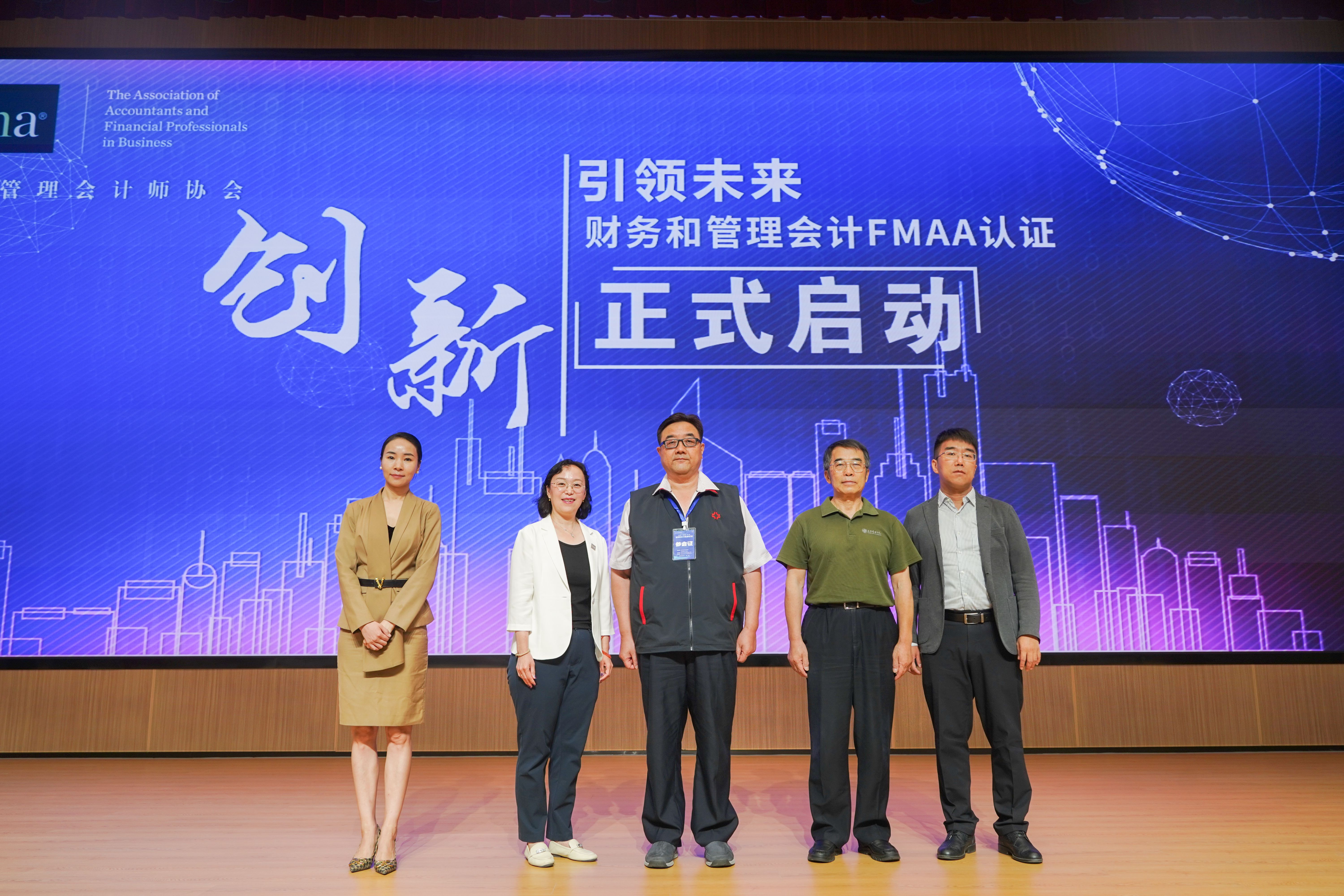 我校董事长王新奇博士、IMA管理会计师协会合作与发展总监周靓、北京大学光华管理学院王立彦教授、天津商业大学太阳网集团tcy8722院长白默教授和河南中赢教育科技集团公司董事长王莹玉等五位嘉宾共同启动了IMA管理会计师协会FMAA资格证书认证发布仪式。