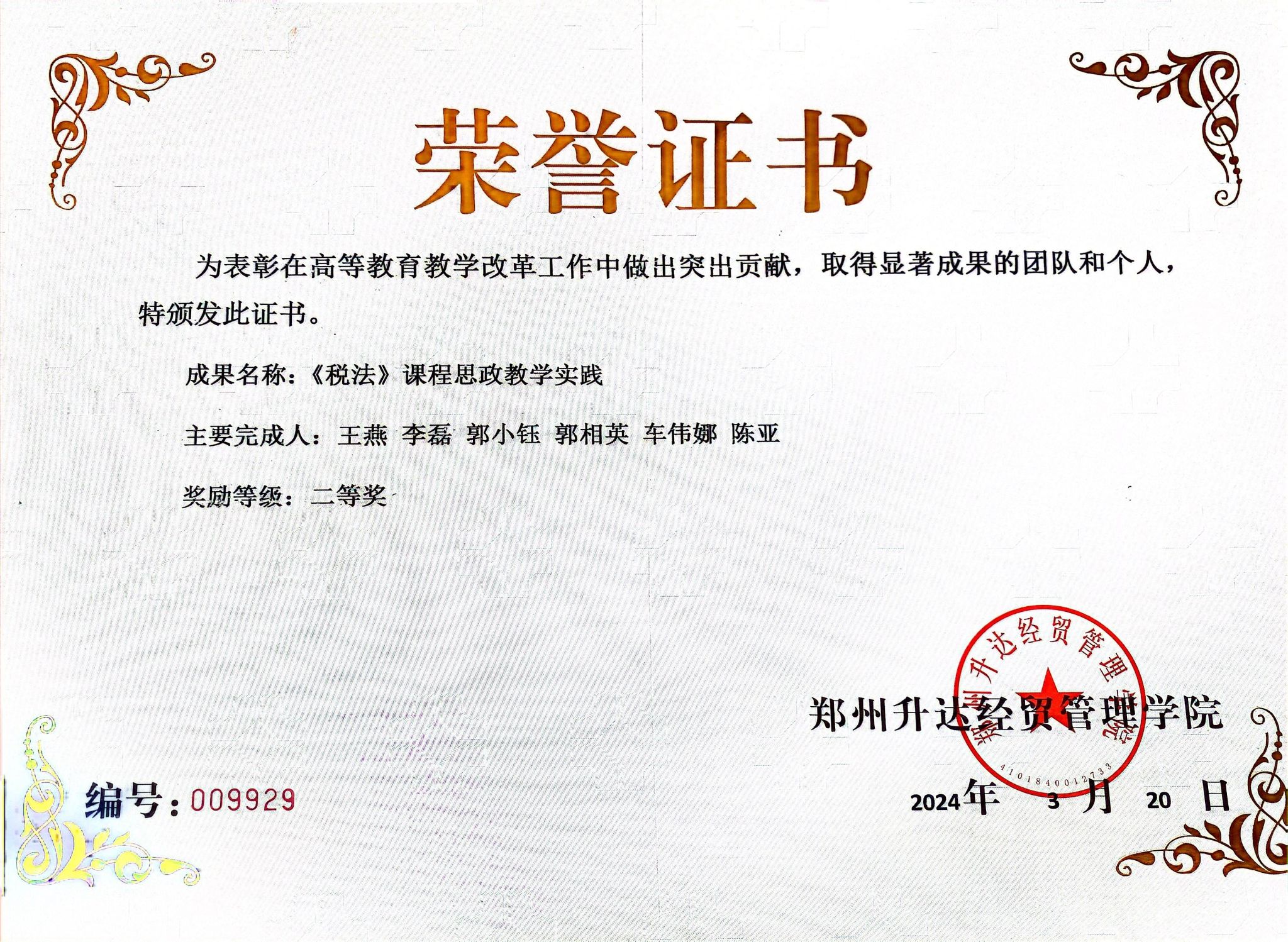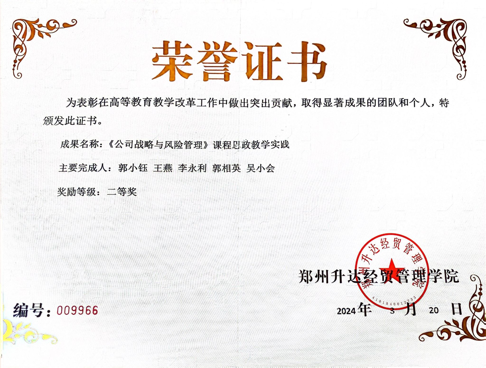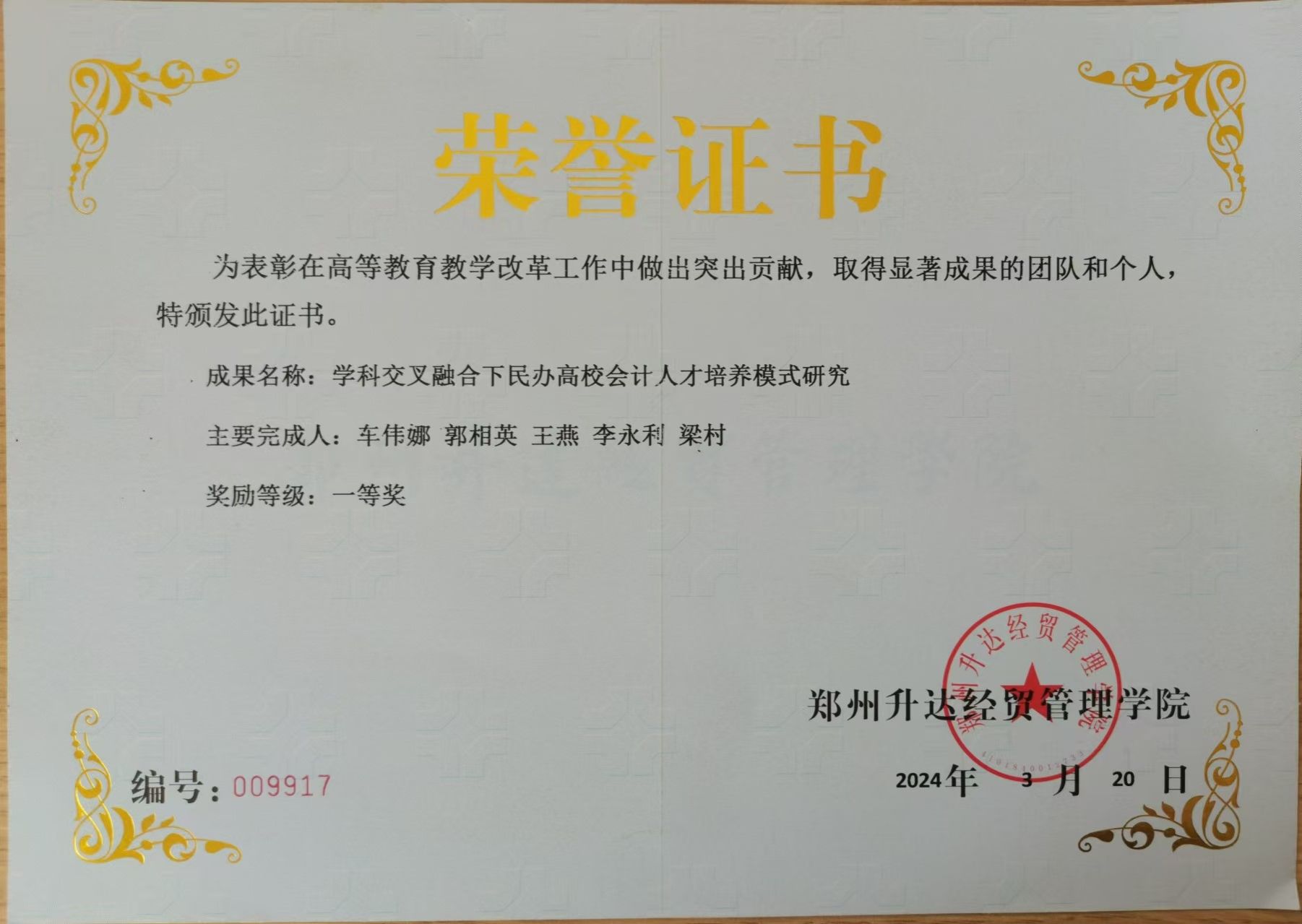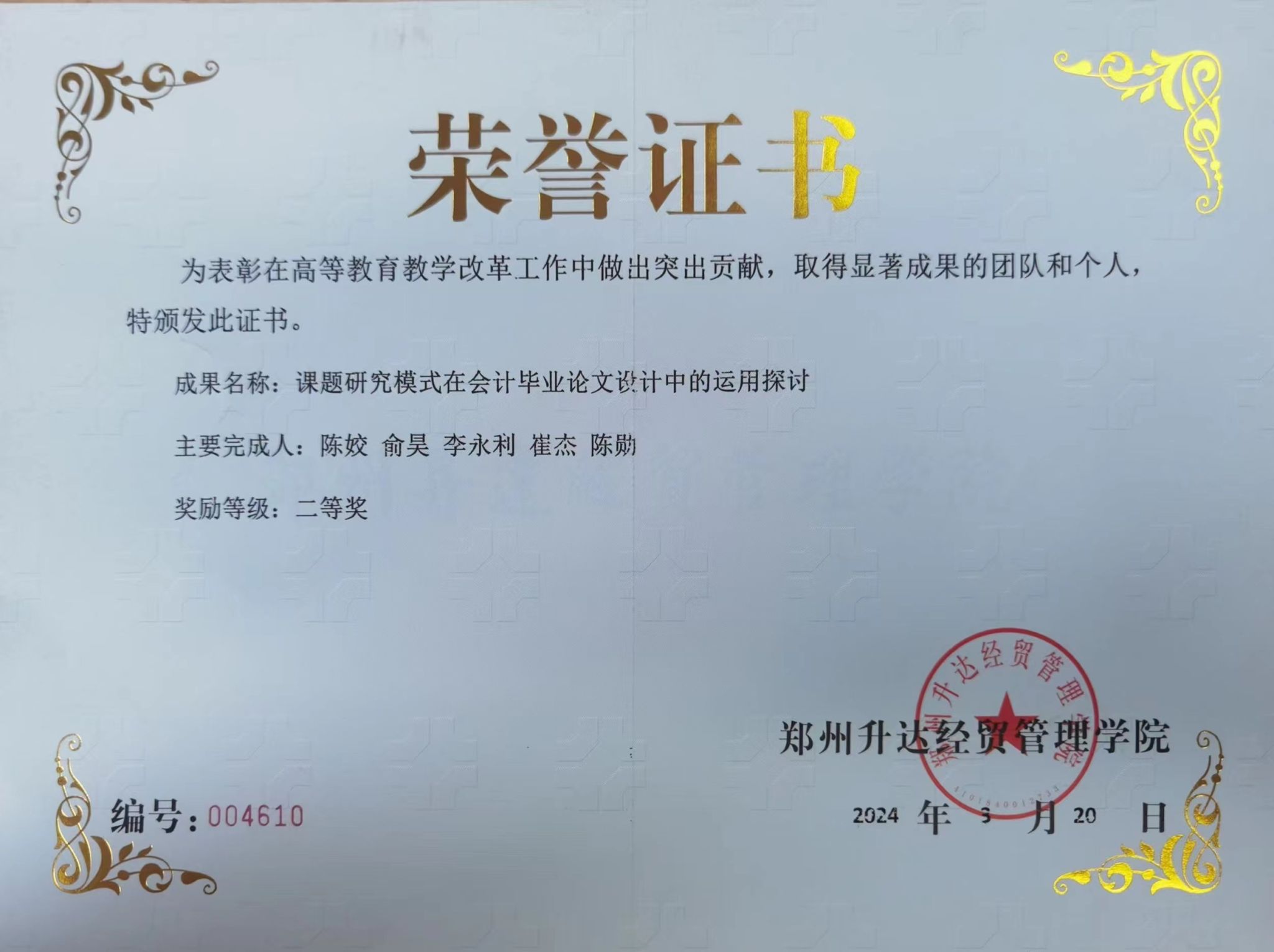 根据《太阳网集团8722关于申报评选2023年校级教学成果奖的通知》,经教师自主申报、学院遴选及校教学工作委员会评审,太阳网集团tcy8722车伟娜老师的“学科交叉融合下民办高校会计人才培养模式研究”获教学成果一等奖,郭小钰老师的“《公司战略与风险管理》课程思政教学实践”、王燕老师的“《税法》课程思政教学实践”、陈姣老师的“课题研究模式在会计毕业论文设计中的运用探讨”均获教学成果二等奖。